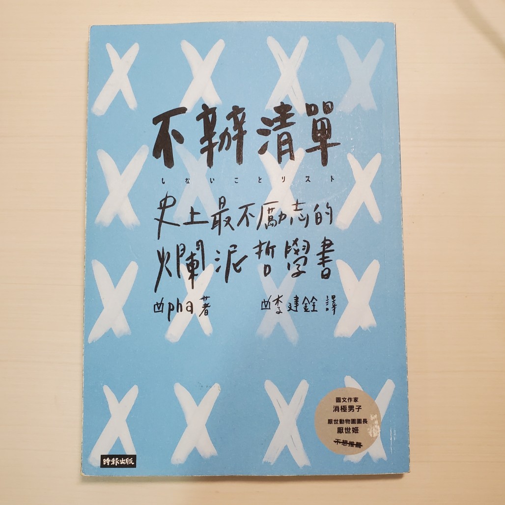 每當工作壓力累積到一定程度時,就會想翻翻這本書,這種厭世、心裡療育相關的書籍近幾年是越來越多,但本書不限於無病呻吟,可以在每個清單內容中看見作者具有一定程度的知識,才能在講述觀念中又搭配許多故事。每次看完都可以連結到每個人生活中的點點滴滴,加以修正自己過於執著、鑽牛角尖的行為。